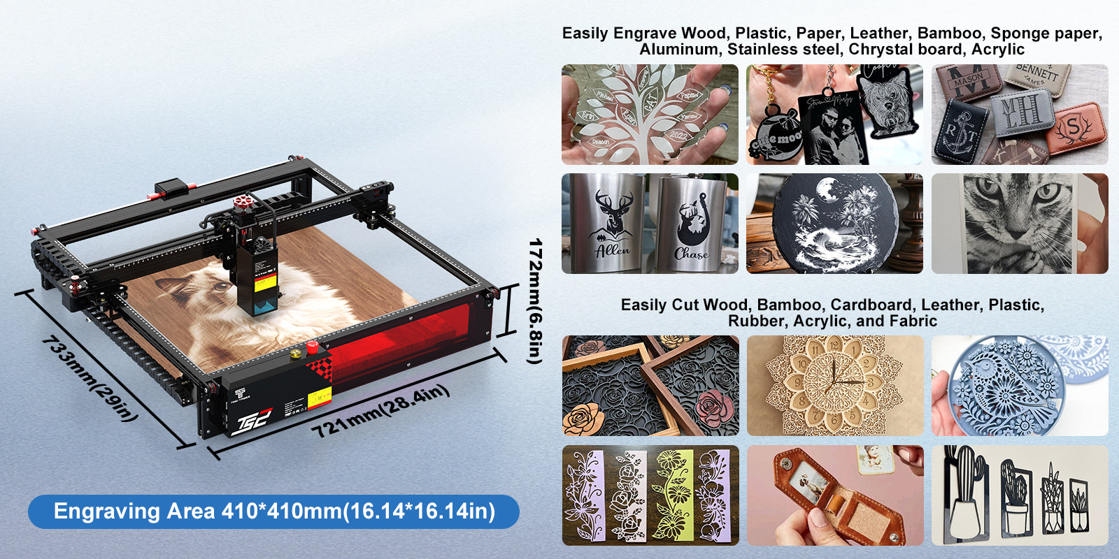 The expansion kit can extend the Y axis, making it themost cost-effective large-area laser engraving machine with a maximum expansion area of 410X900mm.